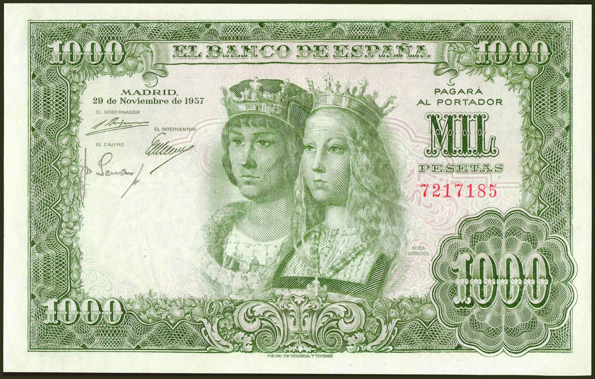 1000 pesetas. November 29, 1957. No series. (Edifil 2021: 469). Unusual, it retains much of its original sizing. Extremely Fine.