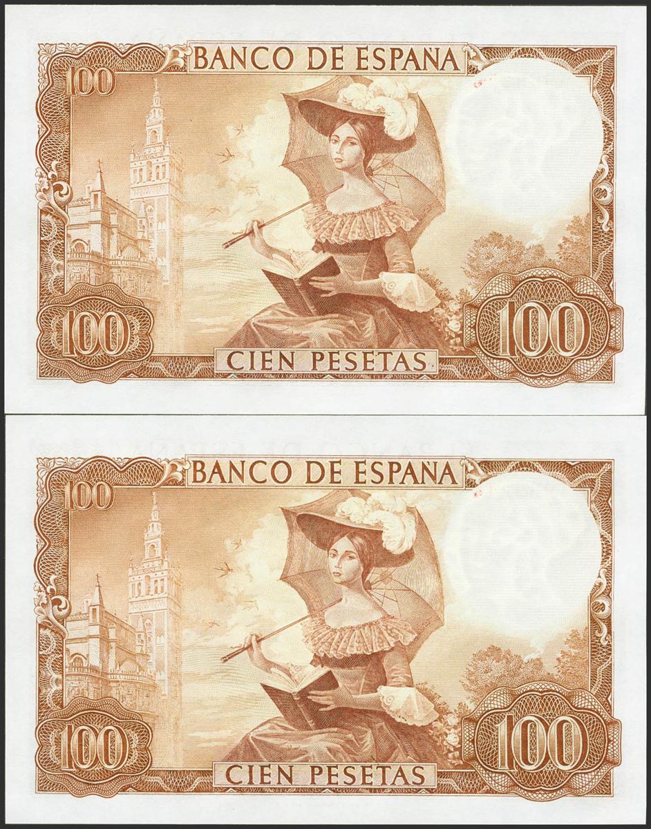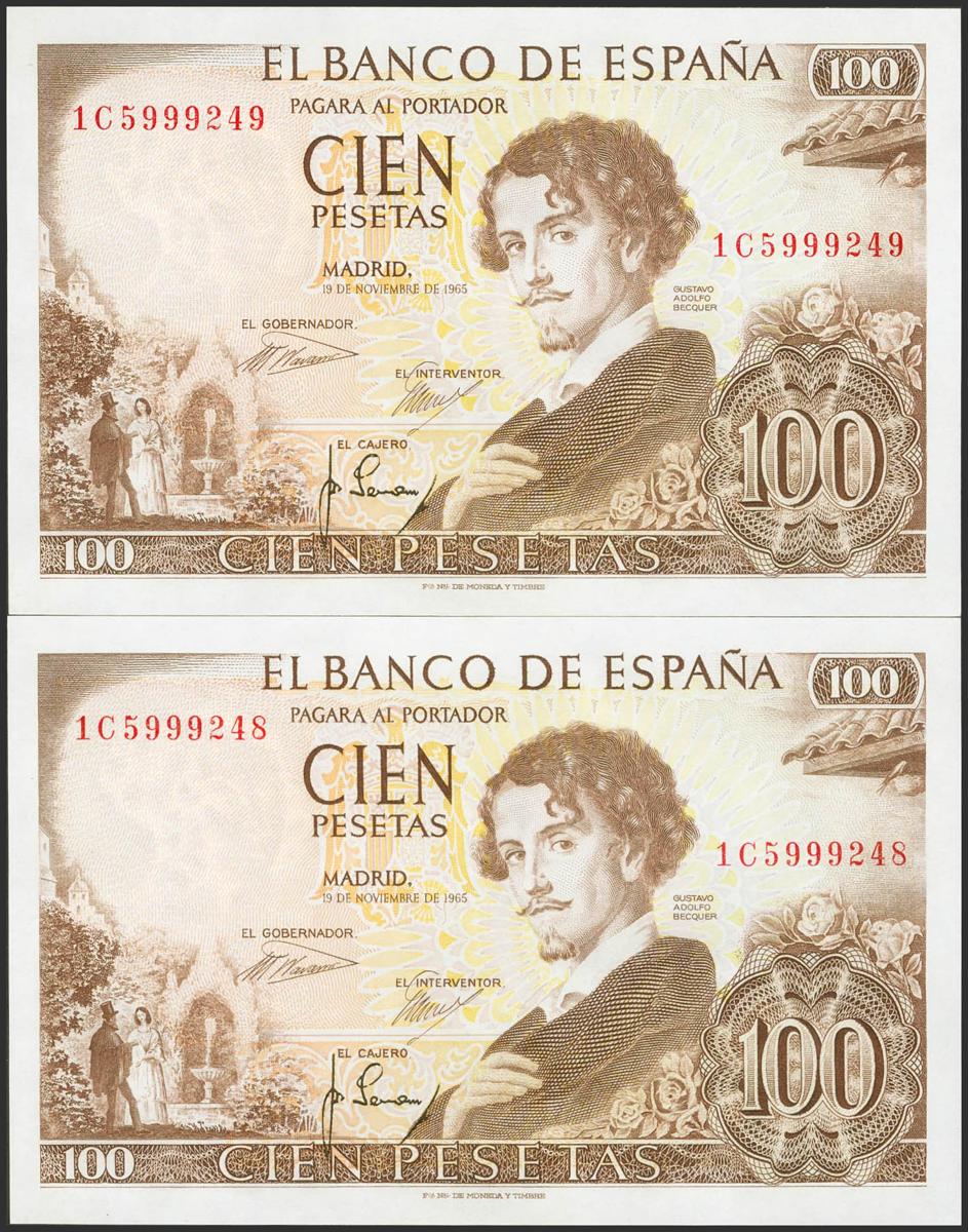 100 pesetas. November 19, 1965. Correlative couple. 1C series. (Edifil 2021: 470a). It retains all its original sizing. Uncirculated.