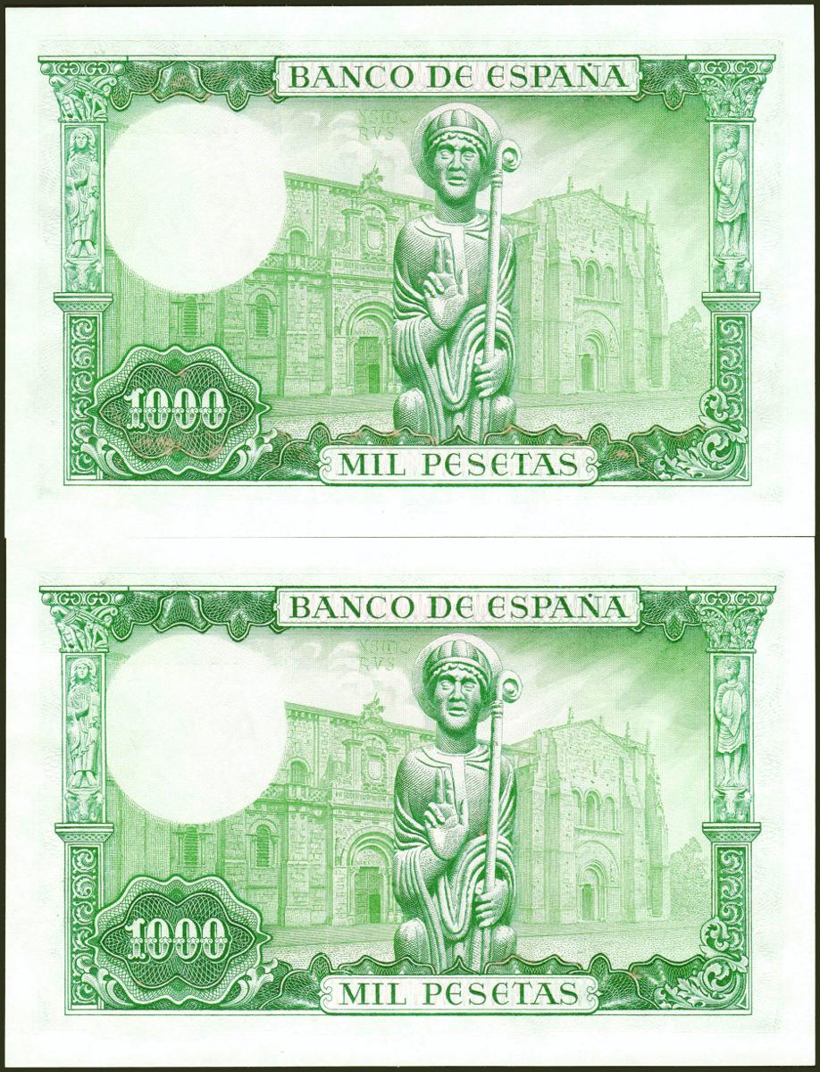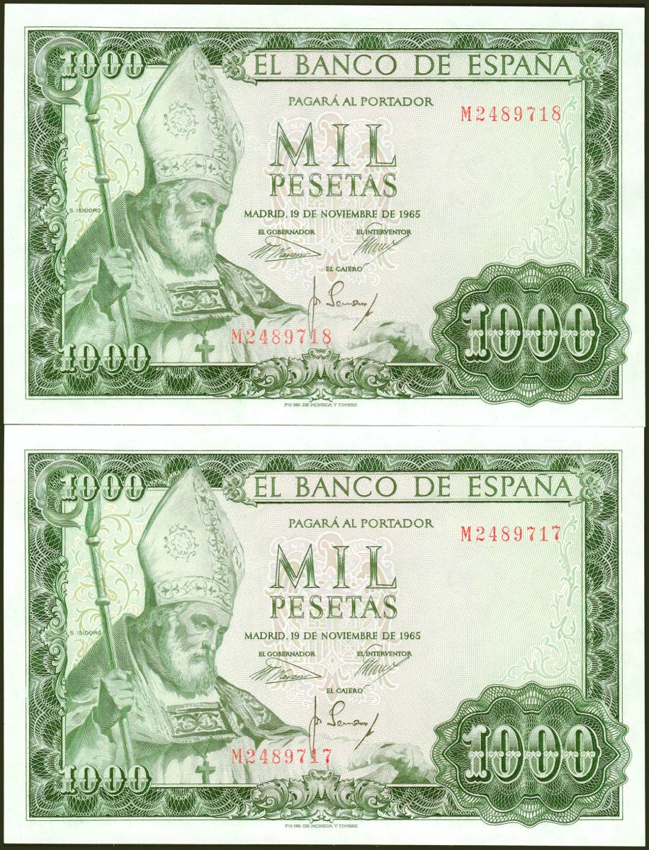 1000 pesetas. November 19, 1965. Correlative couple. Series M. (Edifil 2017: 471b). It retains all its original sizing, one of them an unimportant stain. Almost Uncirculated.