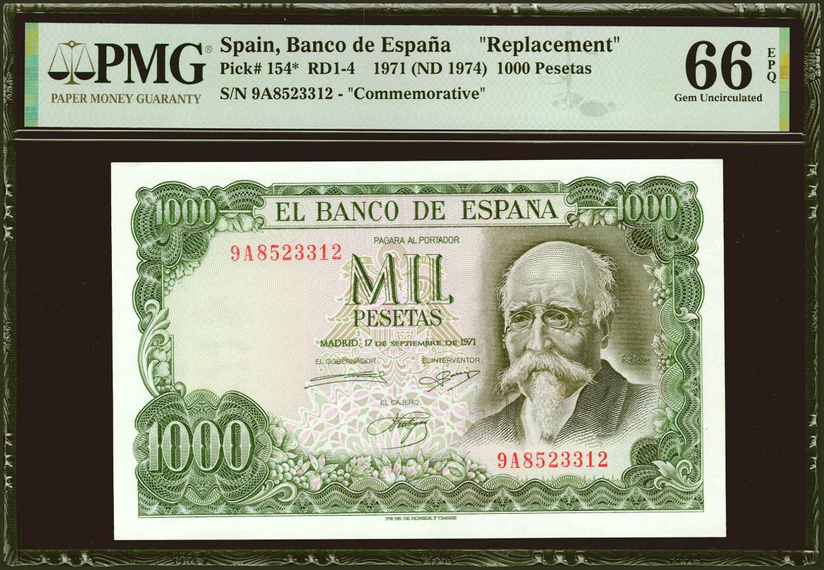 English 1000 pesetas. September 17, 1971. Special series 9A. (Edifil 2021: 474d, Pick: 154*). Very rare in this exceptional quality, original sizing. Uncirculated. PMG66EPQ package.