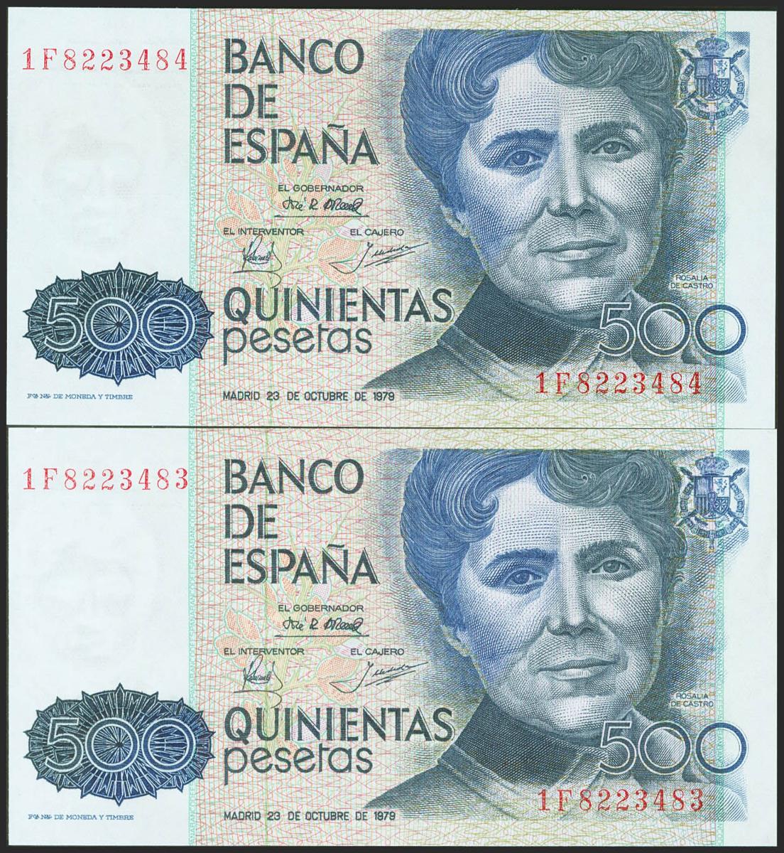 500 pesetas. October 23, 1979. Correlative couple. 1F series. (Edifil 2021: 476a). Uncirculated.