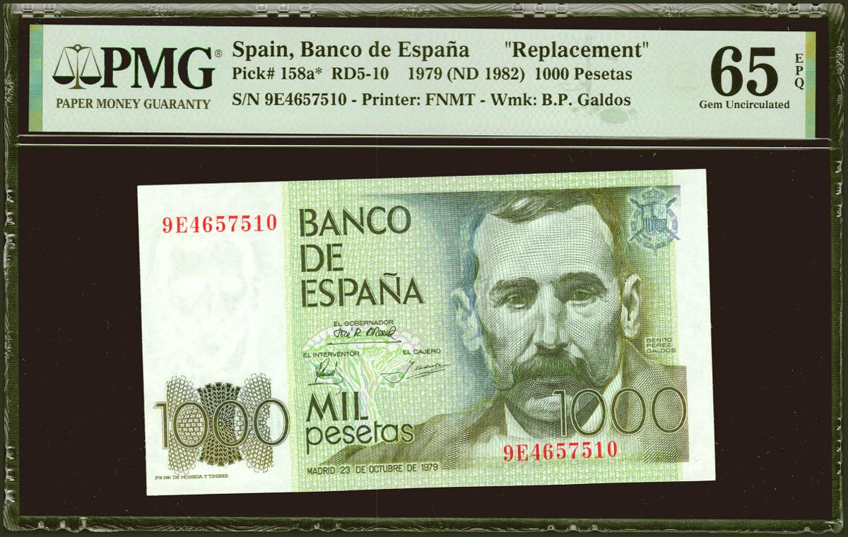 1000 pesetas. October 23, 1979. Special series 9E. (Edifil 2021: 477b, Pick: 158a*). Very rare, series especially in this exceptional quality, original sizing. Uncirculated. PMG65EPQ package.