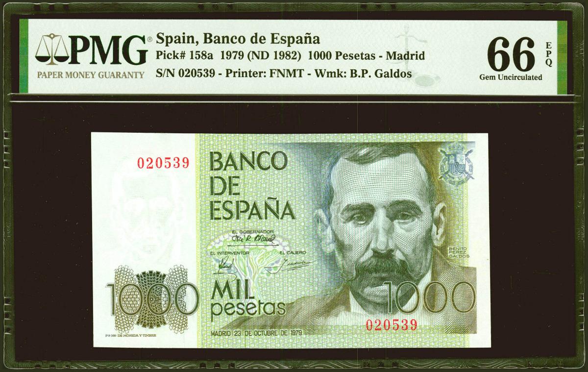 English 1000 pesetas. October 23, 1979. Without series. (Edifil 2021: 477, Pick: 158a). Rare in this exceptional quality. Uncirculated. PMG66EPQ package.