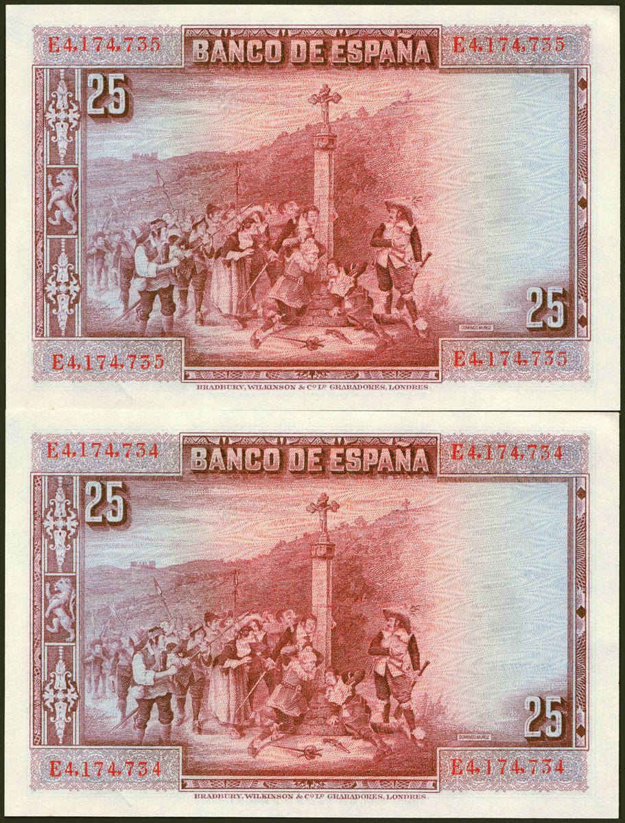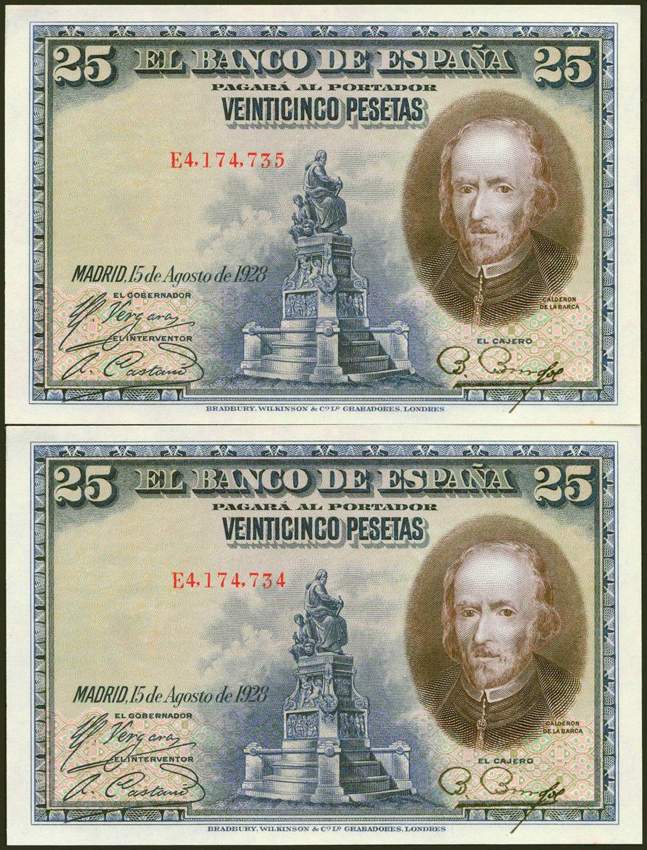 English 25 pesetas. August 15, 1928. Correlative couple. Series E. (Edifil 2021: 353). original sizing Uncirculated.