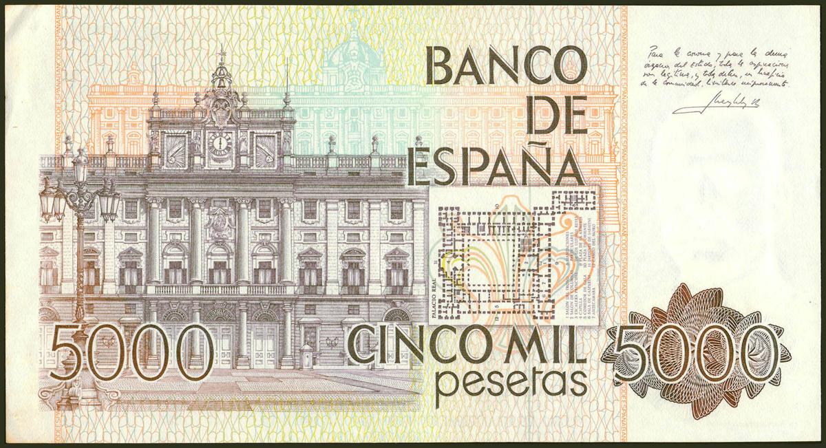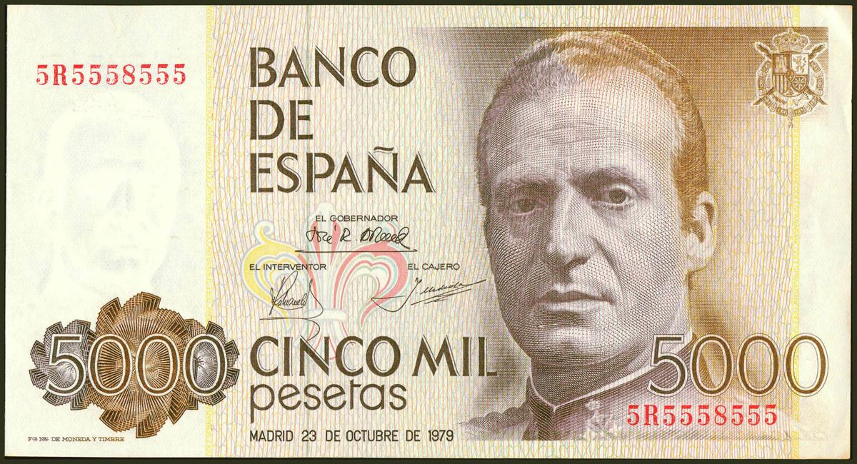 5000 pesetas. October 23, 1979. Series 5R and palindrome numbering. (Edifil 2021: 478a). Almost Uncirculated.