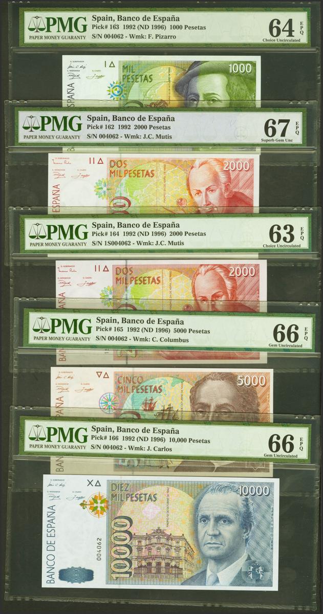English Complete series of 1000, 2000 (in addition to another with the 1S), 5000 and 10000 Pesetas banknotes issued in 1992 and all of them with the same serial number Nº004062. (Edifil 2021: 482/85, 482A). Rare set. Uncirculated. Encapsulated PMG64EPQ, 67EPQ, 63EPQ, 66EPQ and 66EPQ, respectively.