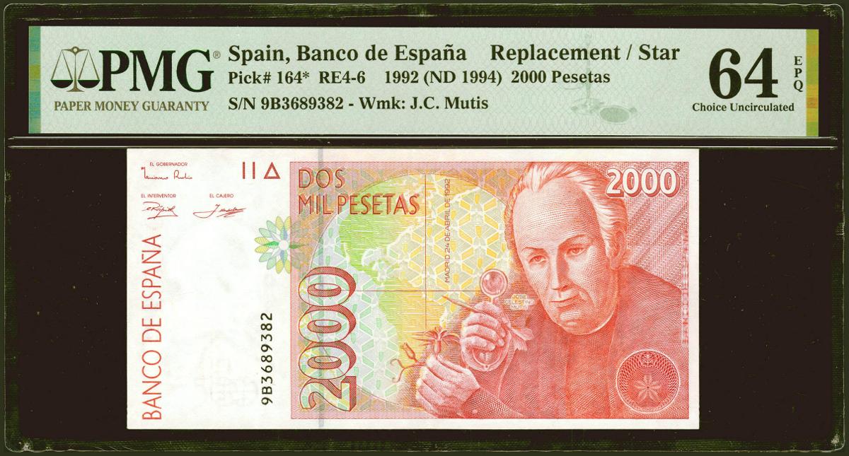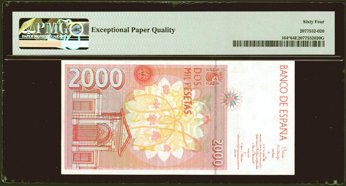 English 2000 pesetas. April 24, 1992. Special series 9B. (Edifil 2021: 482Ab, Pick: 164*). original sizing Uncirculated. PMG64EPQ package.