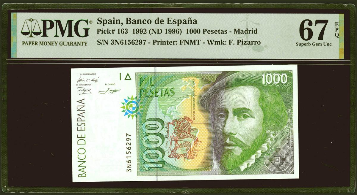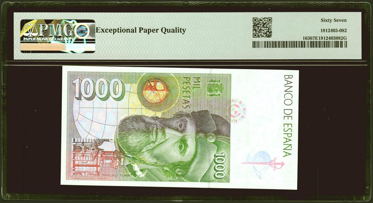 1000 pesetas. October 12, 1992. Series 3N. (Edifil 2021: 483b, Pick: 163). Uncirculated. PMG67EPQ package.