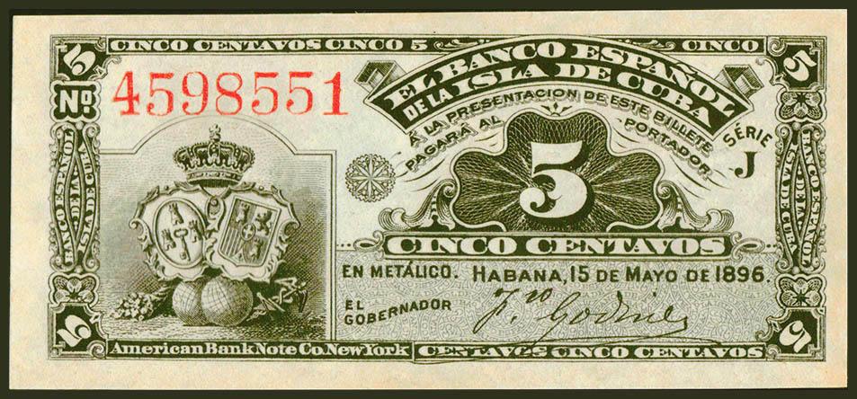 SPANISH BANK OF THE ISLAND OF CUBA. 5 cents. May 15, 1896. Series J. (Edifil 2021: 69). It retains all its original sizing. Uncirculated.