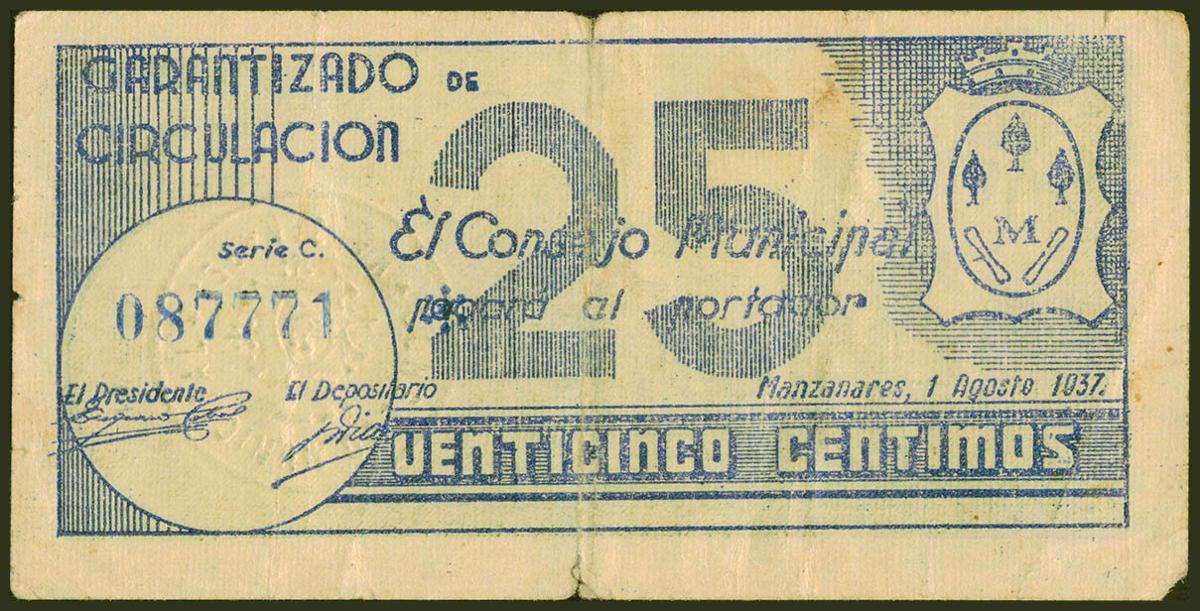 MANZANARES (ROYAL CITY). 25 cents. August 1, 1937. Series C. (González: 3369). Very Fine.