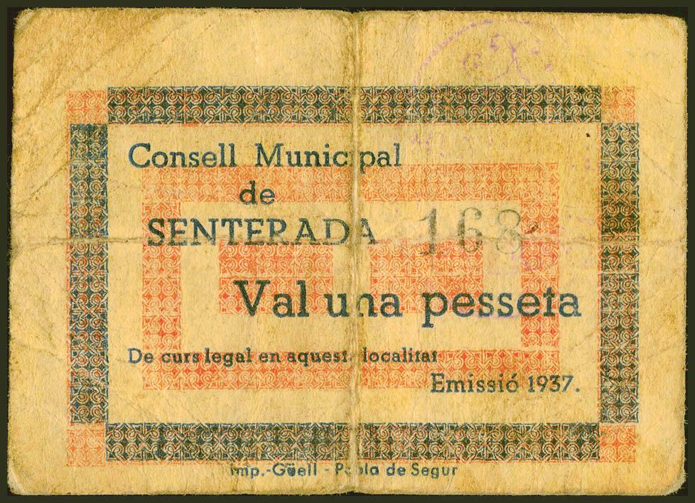 SENT (LERIDA). 1 peseta. 1937. (González: 9943). Very rare. Good.
