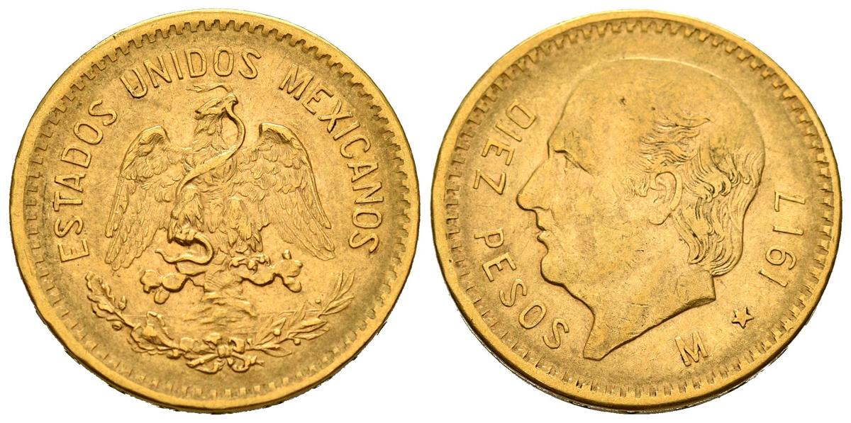 MEXICO. 10 pesos. (Au. 8.31g/23mm). 1917. Mexico. Gentleman. (Km #473). Very Fine.
