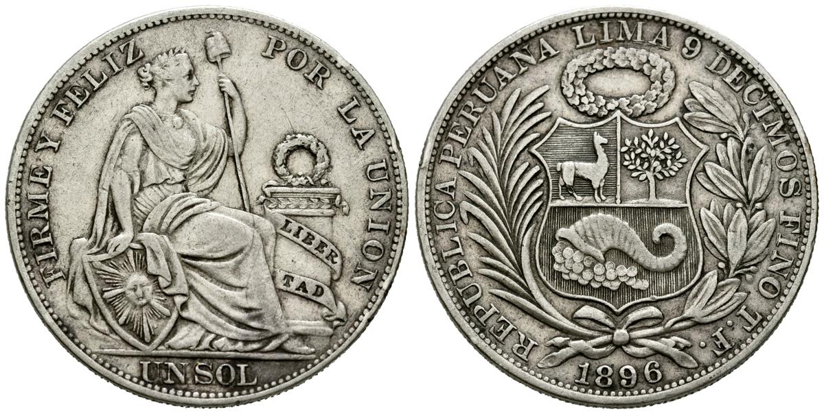 PERU. 1 Sol. (Arm. 24.82g/37mm). 1896. Lima TF. (Km #196). Very Fine.