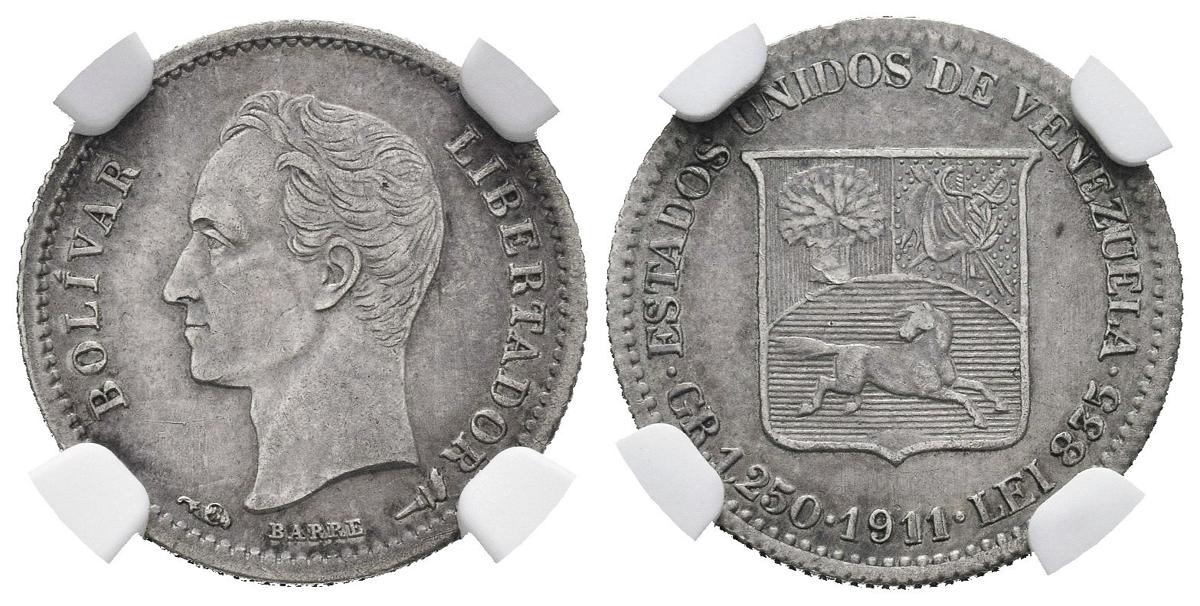UNITED STATES OF VENEZUELA. 1/4 of Bolivar. (Ar. 1.25g/15mm). 1911. (Km#Y20). Encapsulation NGC AU Details. Scratch.