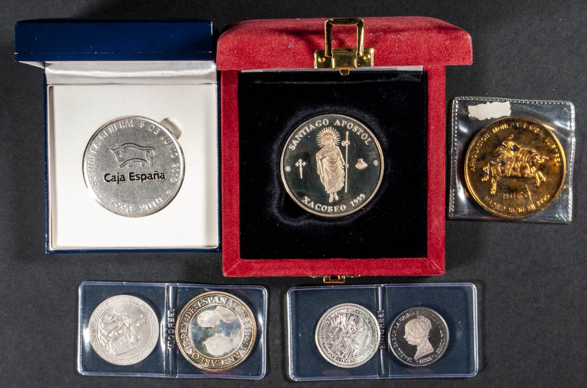 English SPAIN. Set of 7 silver medals with various dates and themes. Includes a 2000 Pesetas coin from 1989. Different states of conservation. TO EXAMINE.