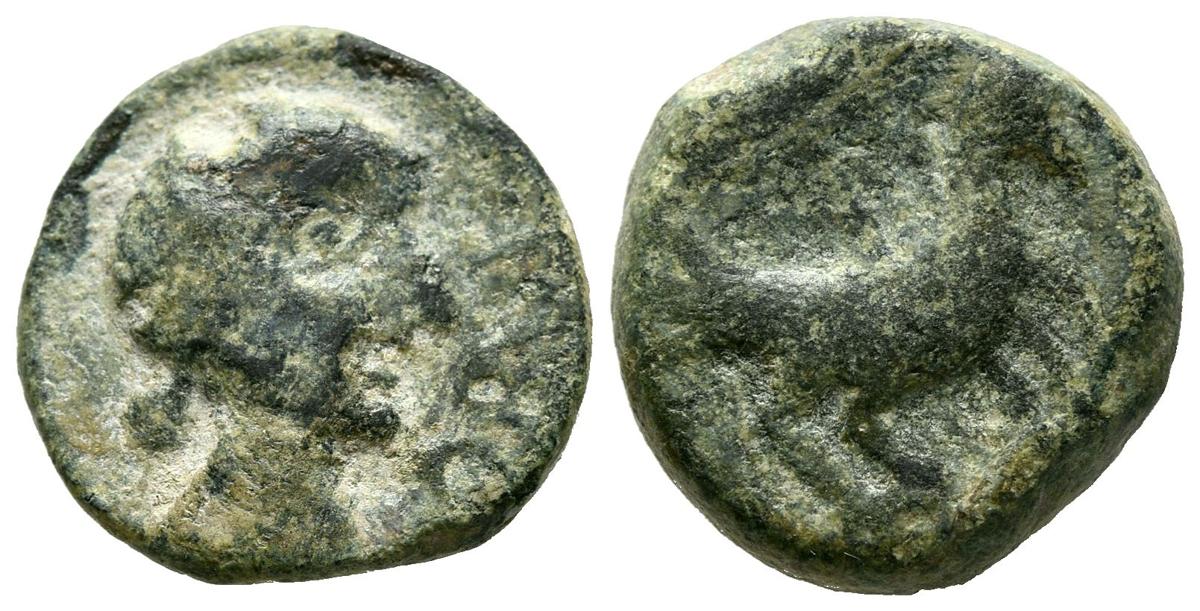 OBULCO (Porcuna, Jaén). Semis. (Ae. 5.79g/17mm). 220-20 BC (FAB-1843). Obv: Head of Apollo to the right, in front legend: OBVLCO. Rev: Eagle right. Very Fine.