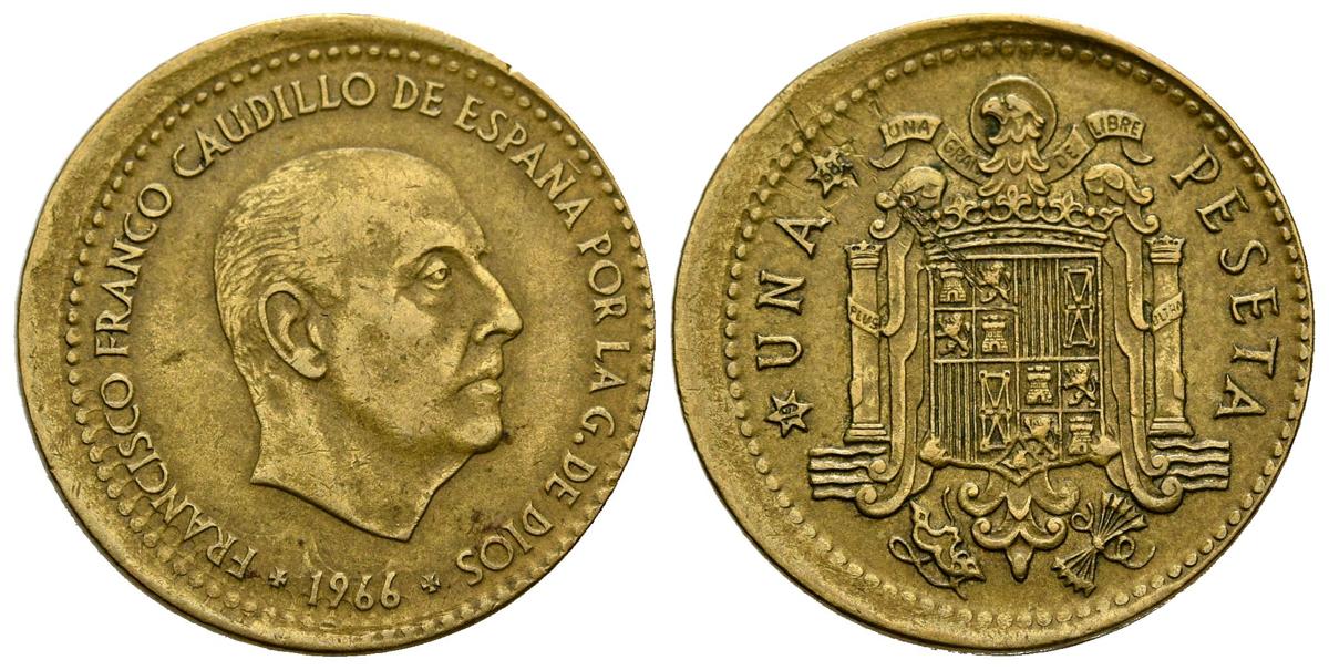 SPANISH STATE. 1 peseta. (AlCu. 3.53g/21mm). 1966 *19-68. Madrid. (Cal-69). Variant: offset coinage and round edge. Good Very Fine.