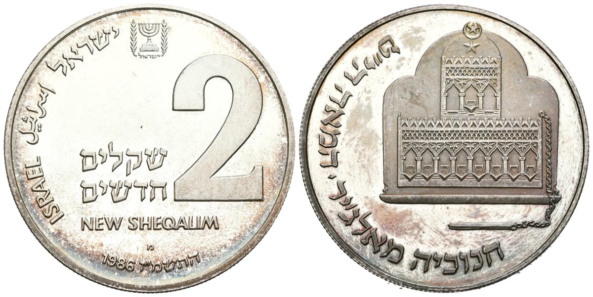 ISRAEL. 2 New Sheqalim. (Ar. 28.82g/37mm). 1986. Stuttgart. Hanukkah. (Km #176). PROOF. Slight marks. Circulation of only 8343 units.
