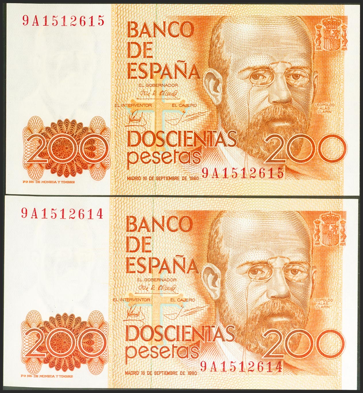 200 pesetas. September 16, 1980. Correlative couple. Special series 9A. (Edifil 2021: 480b). Uncirculated.