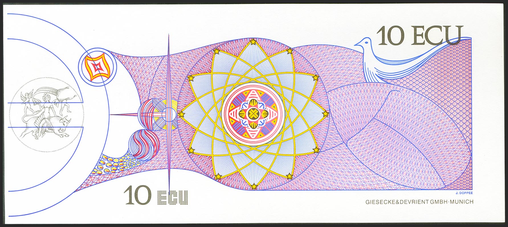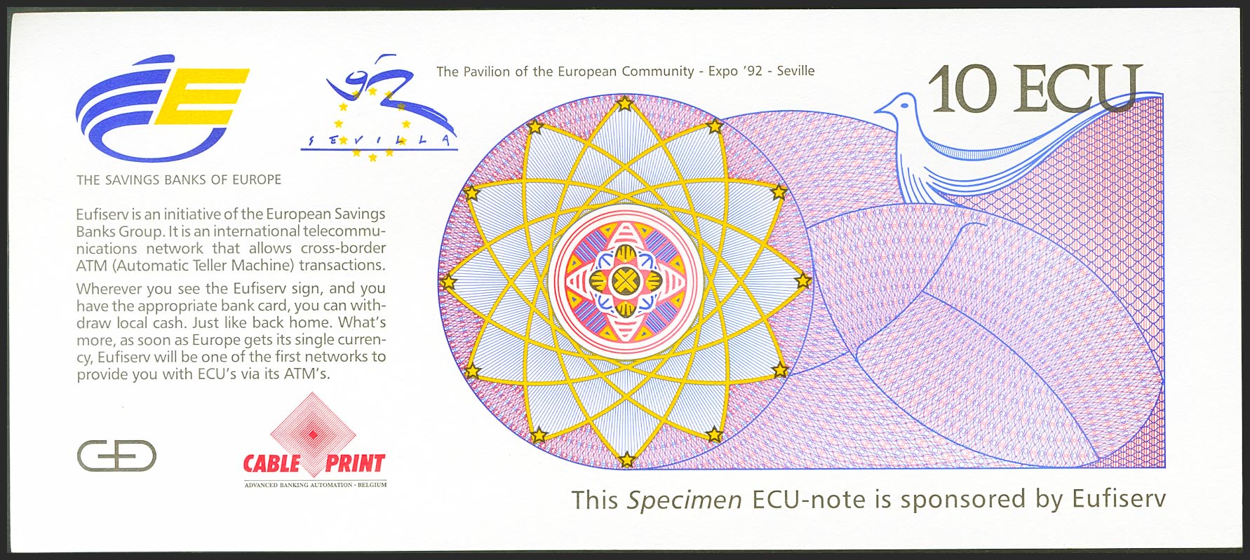 10 Ecu. 1992. SPECIMEN. Promotional ticket of the single European currency, the Ecu, exhibited in the pavilion of the European Community on the occasion of the Universal Exposition in Sevilla. Very rare. Almost Uncirculated.