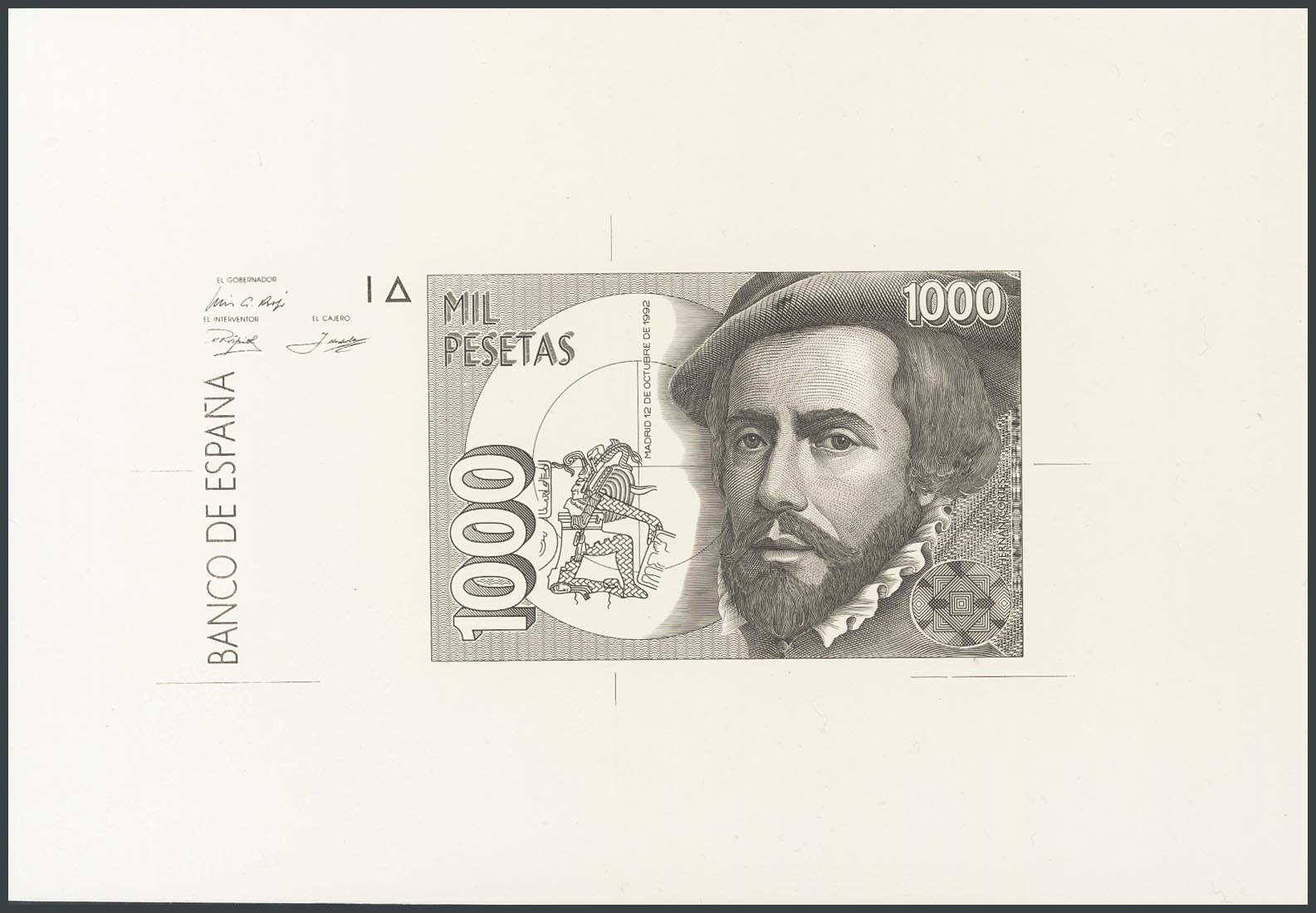 English Proof of engraving in black on the obverse of the 1000 Pesetas bill, issued on October 12, 1992 (type II, dark eyelid). (Edifil 2017: 483a). Piece of enormous spectacularity and rarity.