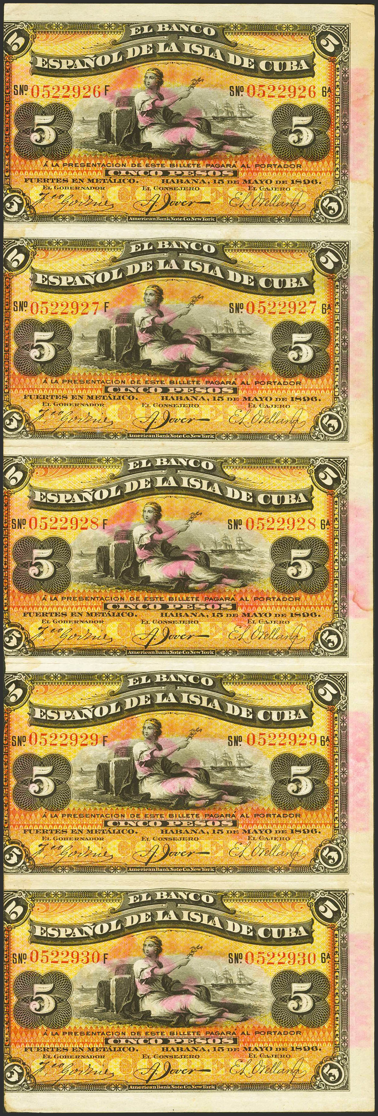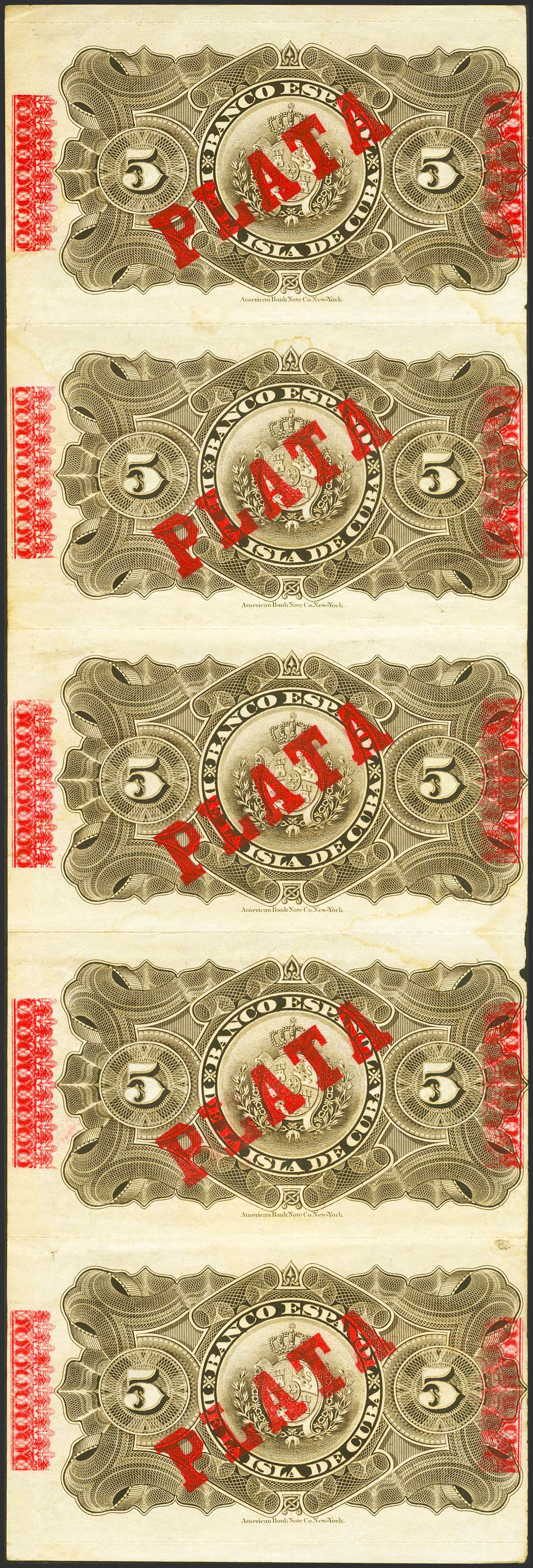 SPANISH BANK OF THE ISLAND OF CUBA. Set of 5 correlative bills of 5 Pesos (without detaching), issued on May 15, 1896 with SILVER surcharge, on the back. (Edifil 2021: 81). Rare, original sizing. Almost Uncirculated.