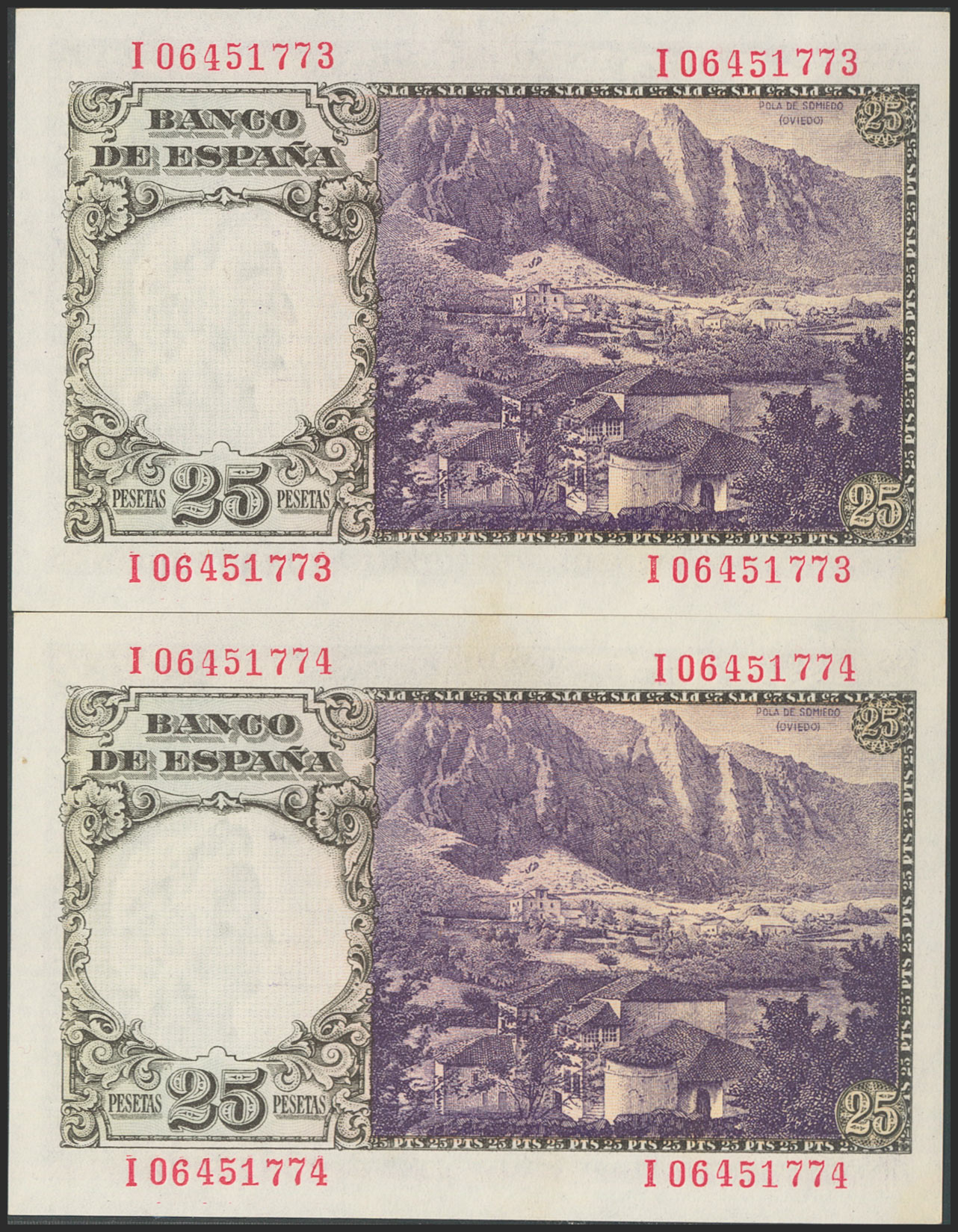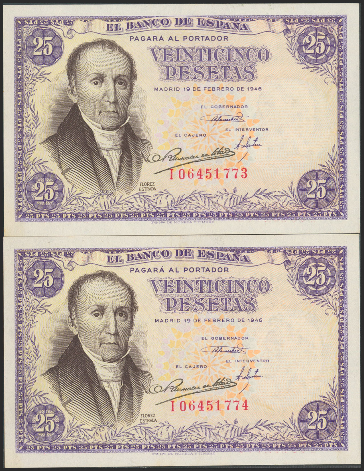 25 pesetas. February 19, 1946. Correlative couple. Series I. (Edifil 2017: 450a). original sizing Uncirculated.