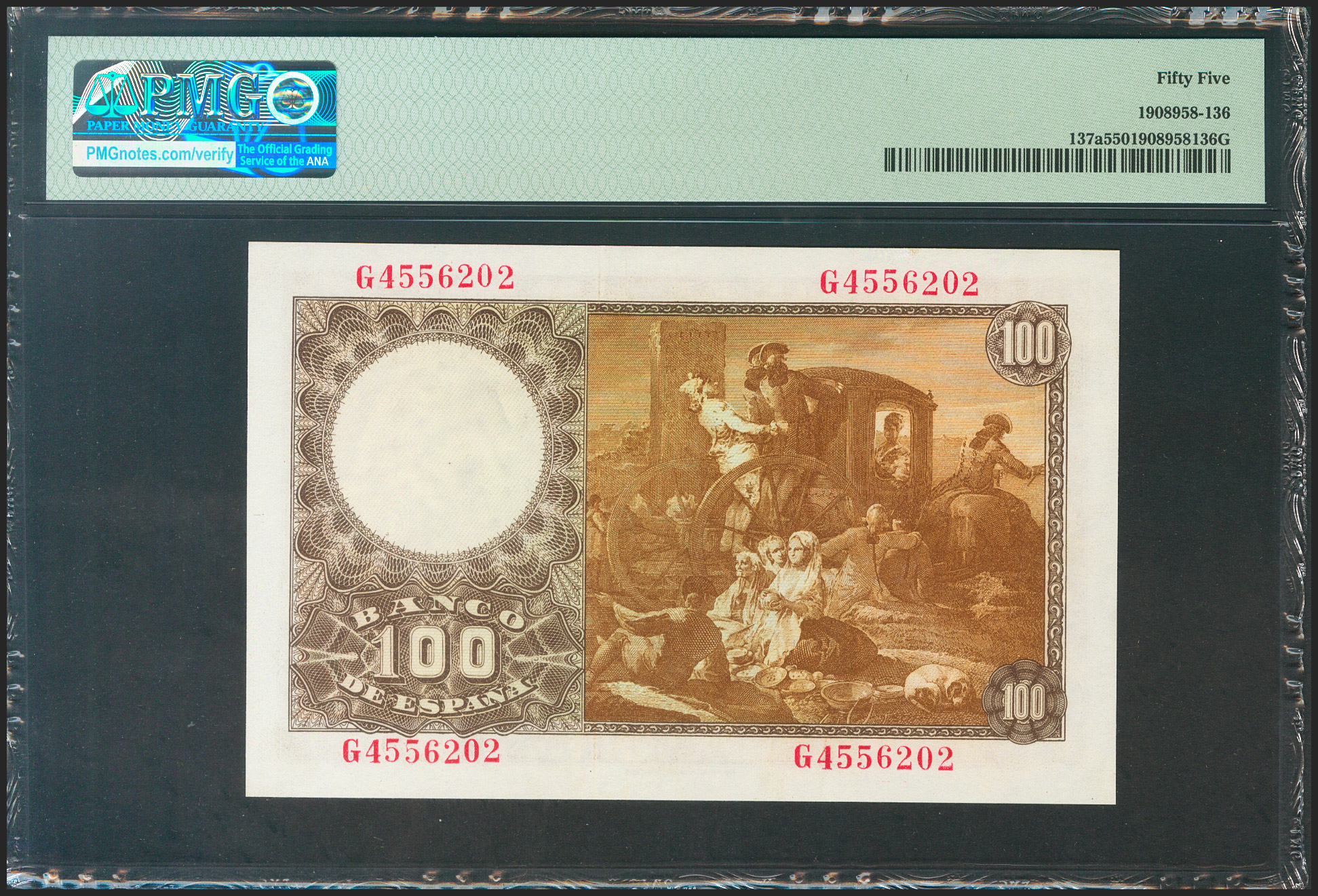 100 pesetas. May 2, 1948. Series G. (Edifil 2021: 456a, Pick: 137a). Good Extremely Fine. PMG55 package.