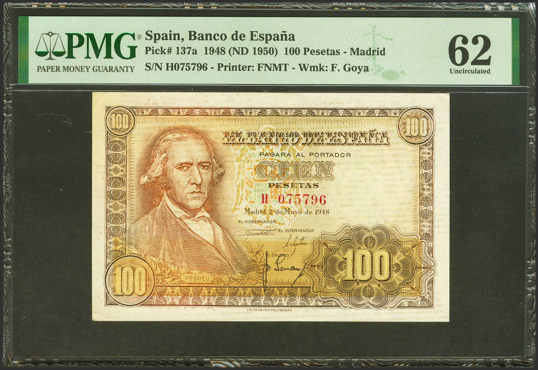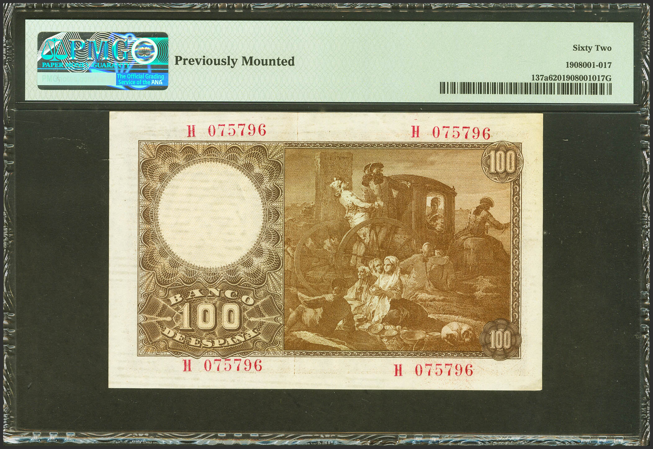 English 100 pesetas. May 2, 1948. Series H. (Edifil 2021: 456a, Pick: 137a). Uncirculated. PMG62 package (previously mounted).
