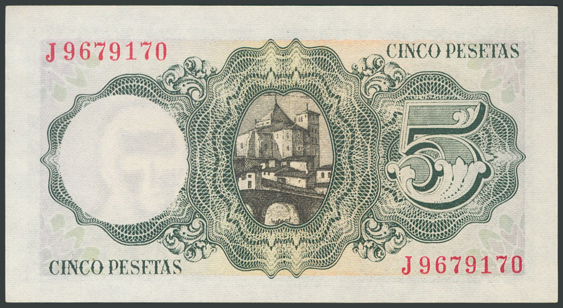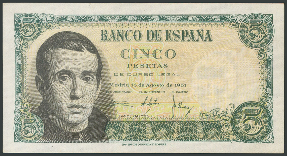 5 pesetas. August 16, 1951. Series J. (Edifil 2017: 459a). original sizing Uncirculated.