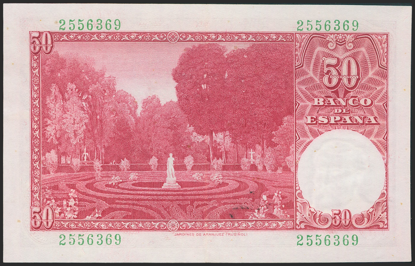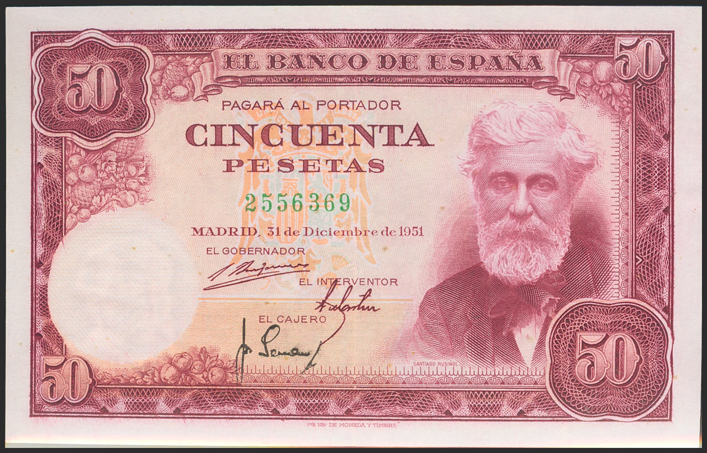 English 50 pesetas. December 31, 1951. No series. (Edifil 2021: 462). It retains much of the original sizing. Good Extremely Fine.