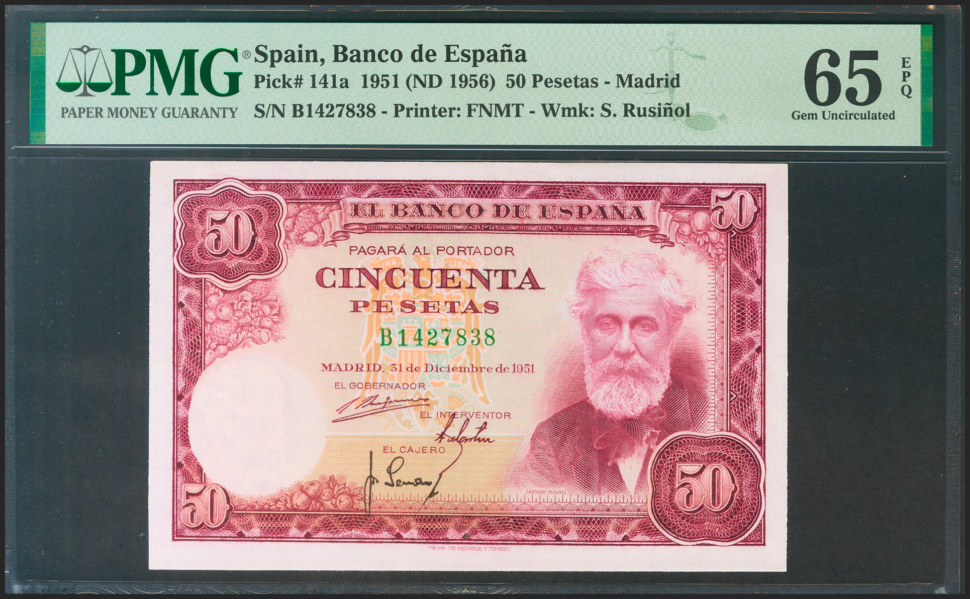 English 50 pesetas. December 31, 1951. Series B. (Edifil 2021: 462a, Pick: 141a). Rare in this quality, original sizing. Uncirculated. PMG65EPQ package.