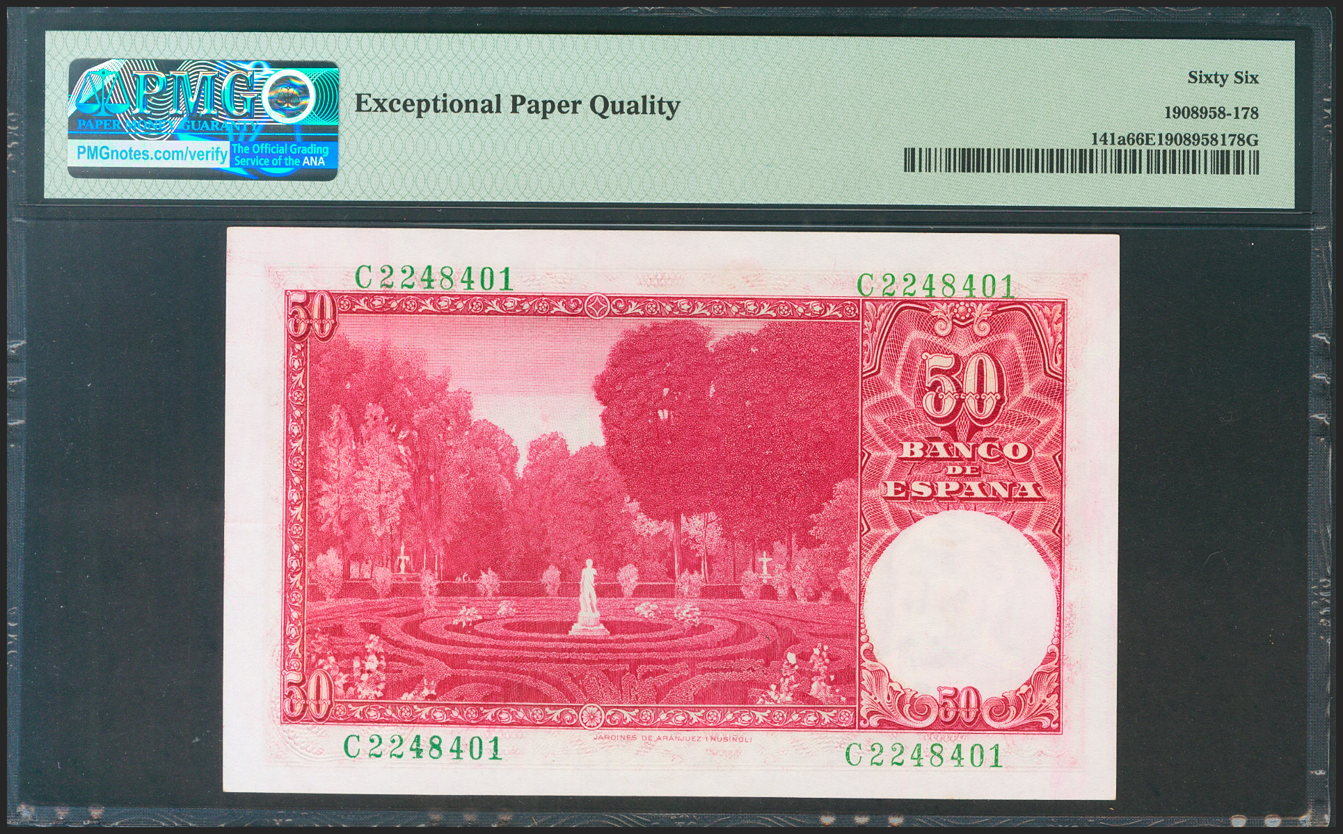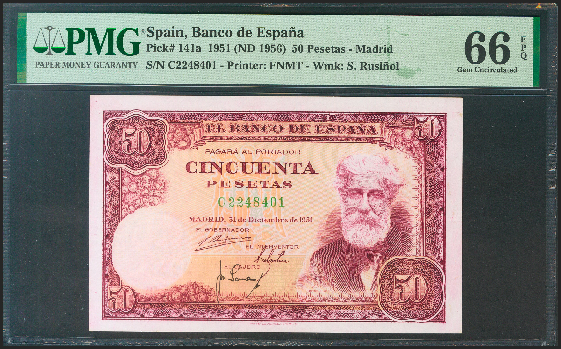 50 pesetas. December 31, 1951. Series C. (Edifil 2021: 462a, Pick: 141a). Very rare in this quality, original sizing. Uncirculated. PMG66EPQ package.
