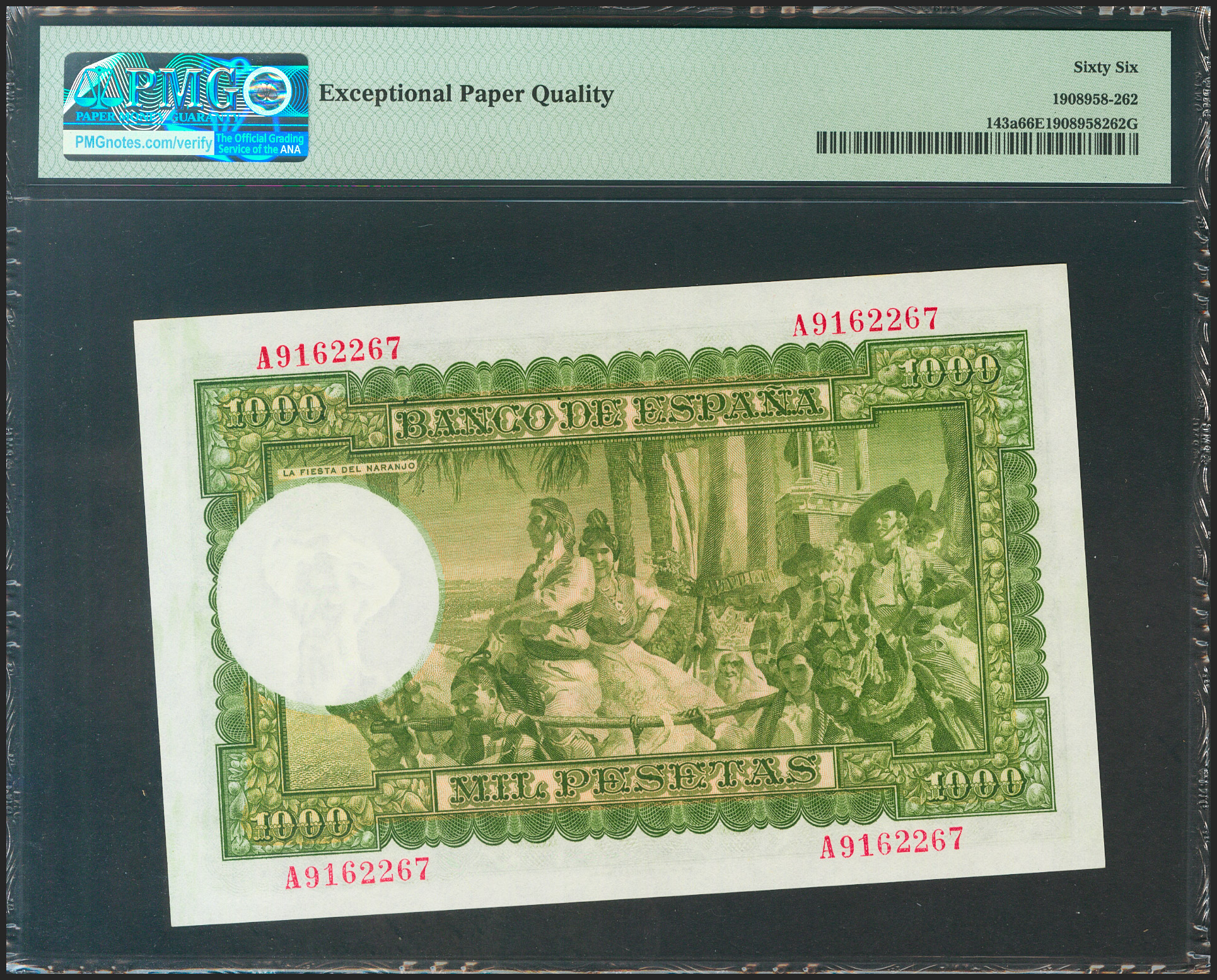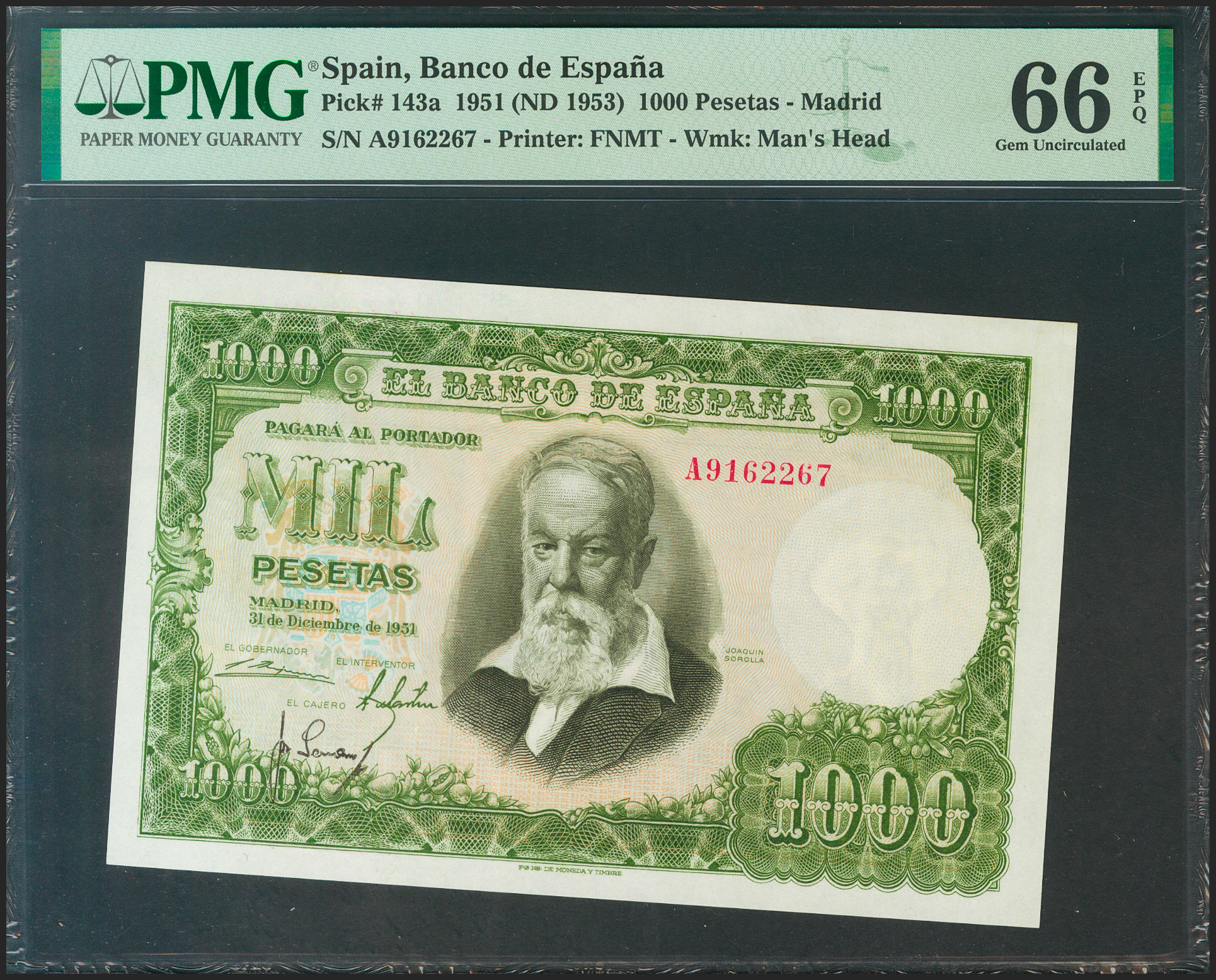 English 1000 pesetas. December 31, 1951. Series A. (Edifil 2021: 463a, Pick: 143a). Very rare in this quality, original sizing. Uncirculated. PMG66EPQ package.