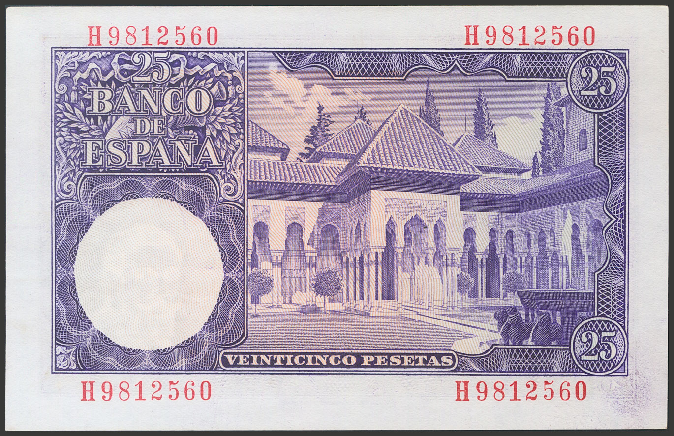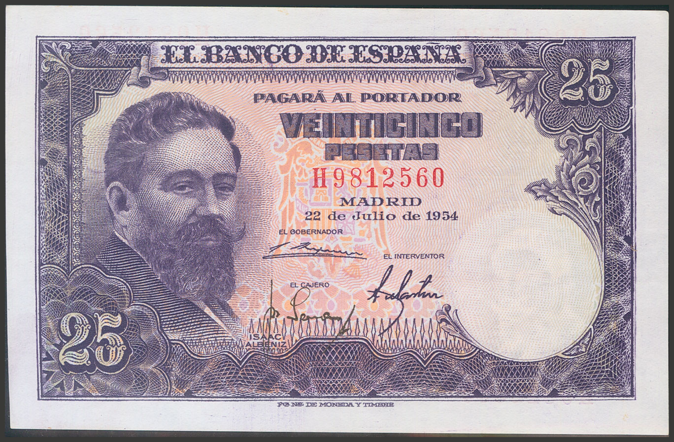 25 pesetas. July 22, 1954. Series H. (Edifil 2017: 467a). original sizing Almost Uncirculated.