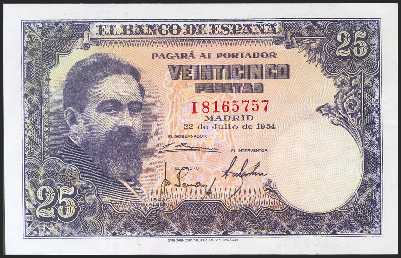 25 pesetas. July 22, 1954. Series I. (Edifil 2021: 467a). original sizing Almost Uncirculated.