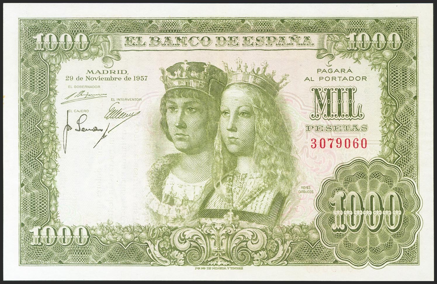 1000 pesetas. November 29, 1957. No series. (Edifil 2021: 469). Unusual, it retains part of its original sizing. Extremely Fine.