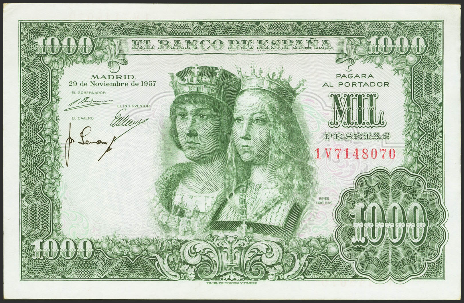 1000 pesetas. November 29, 1957. Series 1V. (Edifil 2017: 469b). It retains all its original sizing. Almost Uncirculated.