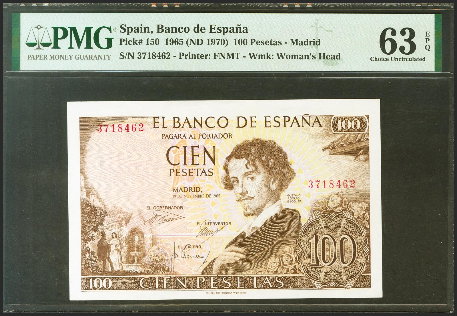 100 pesetas. November 19, 1965. No series. (Edifil 2021: 470, Pick: 150). original sizing Uncirculated. PMG63EPQ package.