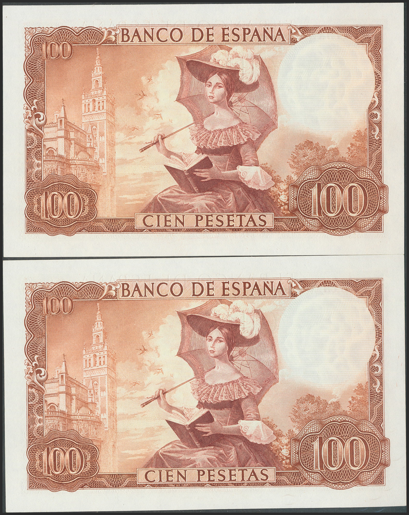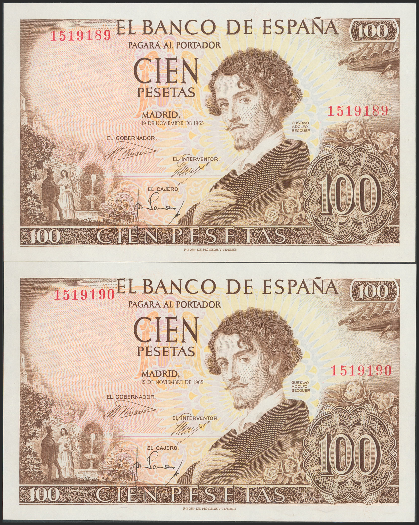 100 pesetas. November 19, 1965. Correlative couple. No serie. (Edifil 2017: 470). original sizing Uncirculated.