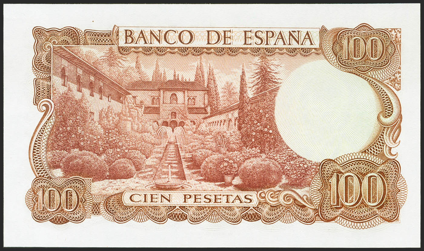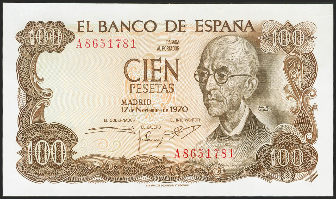 English 100 pesetas. November 17, 1970. Series A. (Edifil 2017: 472a). Keep everything if original sizing. Uncirculated.