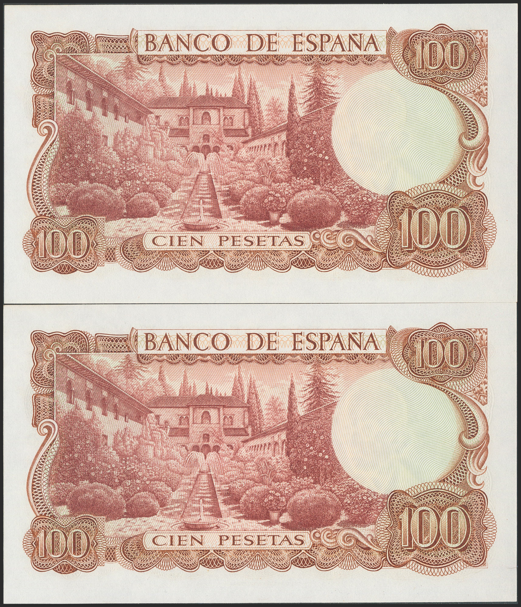 100 pesetas. November 17, 1970. Correlative couple. Series A. (Edifil 2021: 472a). Uncirculated.