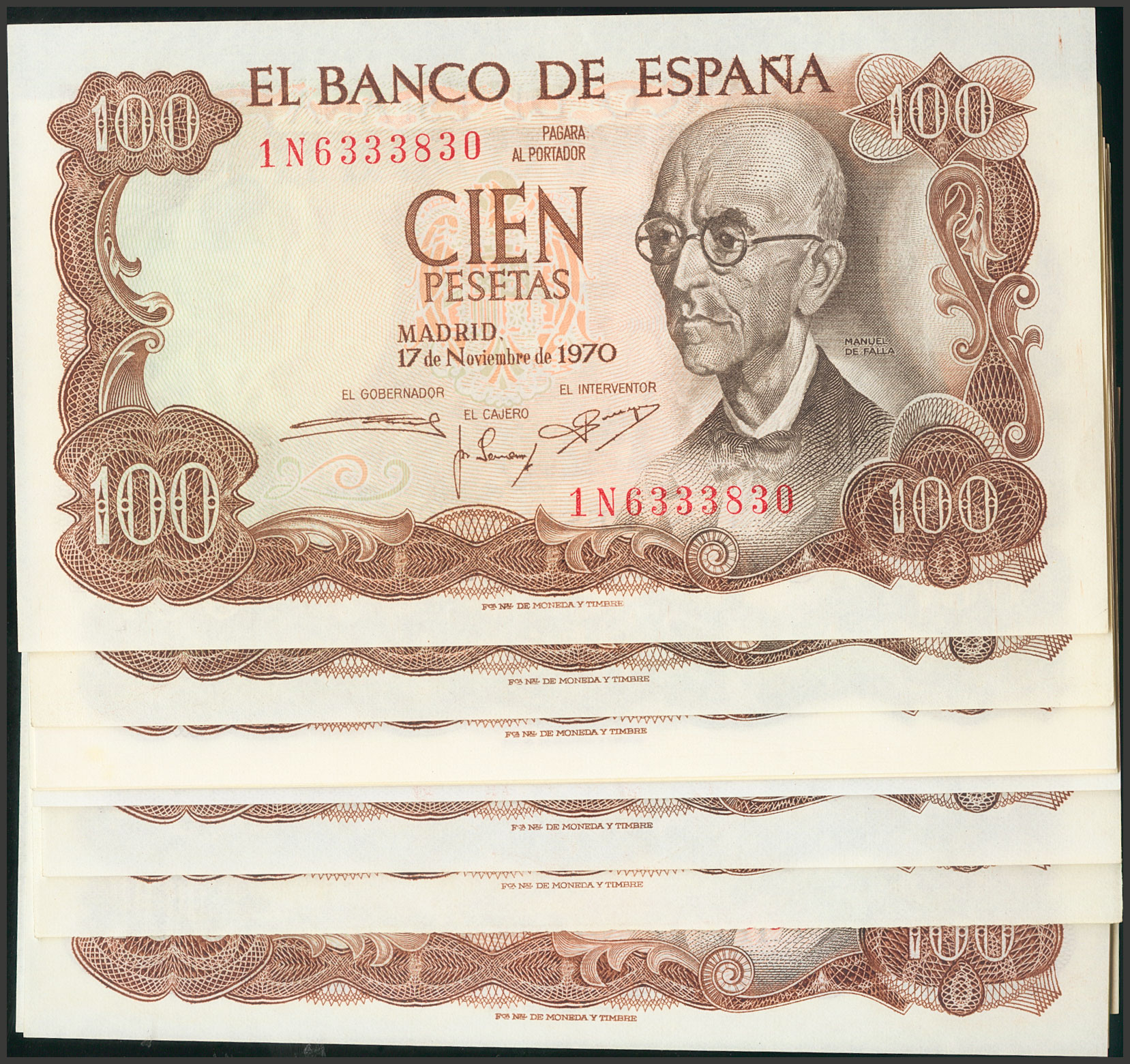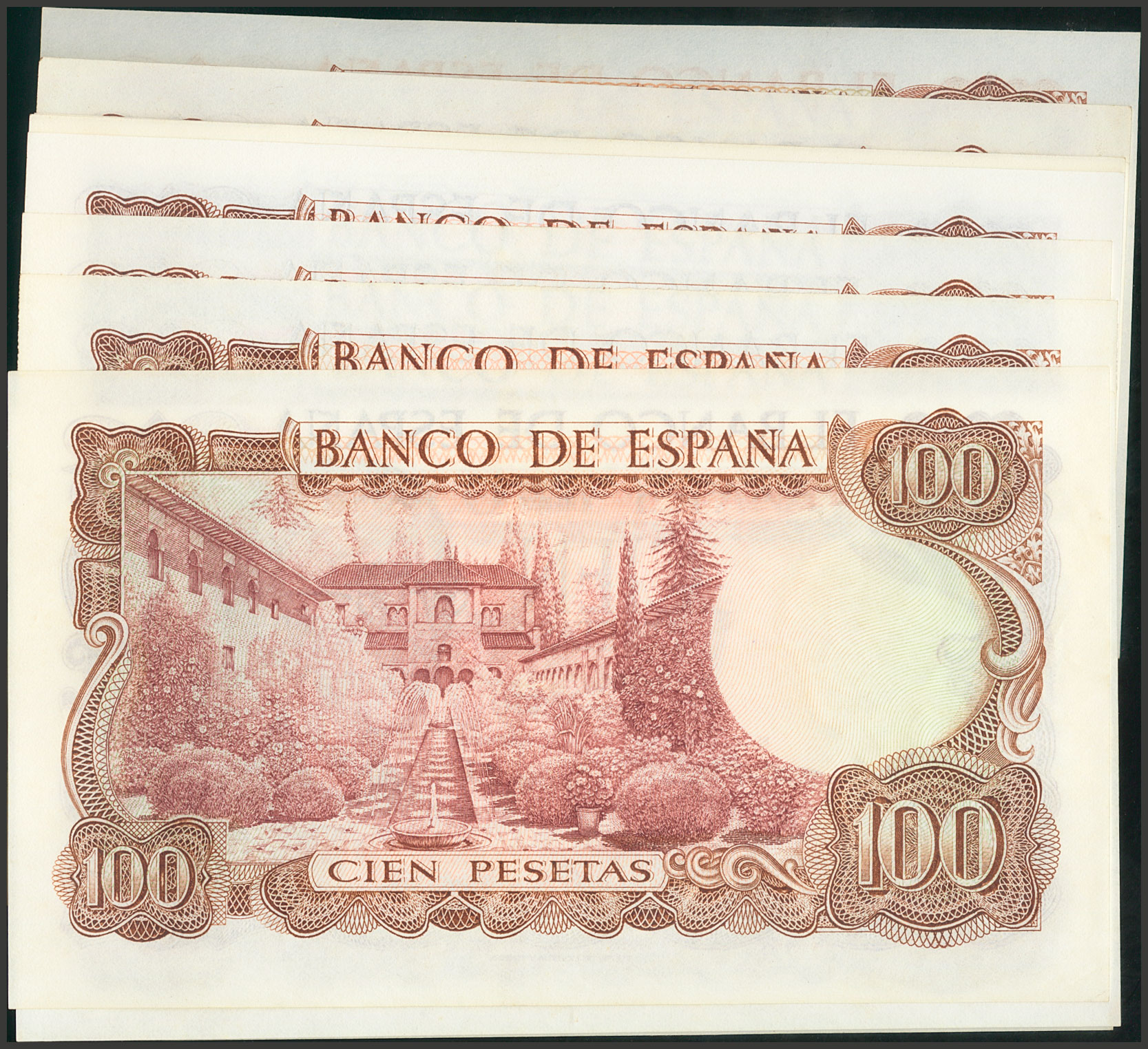 English Set of 12 100 Pesetas banknotes, issued on November 17, 1970, with different series 1N, 2S, 5A, 5I, 5V, 5Z, 6Q, 6S, 6V, 7C, 7D and 7F (Edifil 2017: 472c), with its original size. Uncirculated/ Almost Uncirculated.