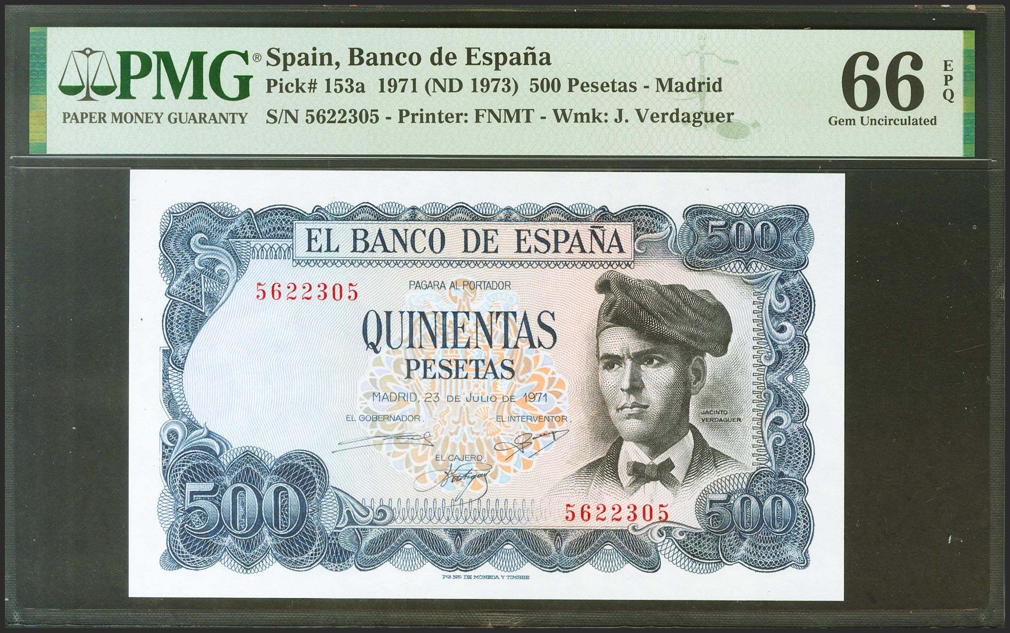 English 500 pesetas. July 23, 1971. No series. (Edifil 2021: 473). Rare in this quality, it retains all its original sizing. PMG66EPQ package.