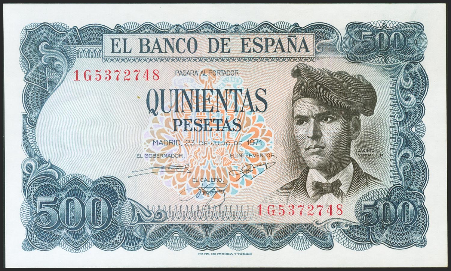 500 pesetas. July 23, 1971. Series 1G. (Edifil 2021: 473a). original sizing Uncirculated.