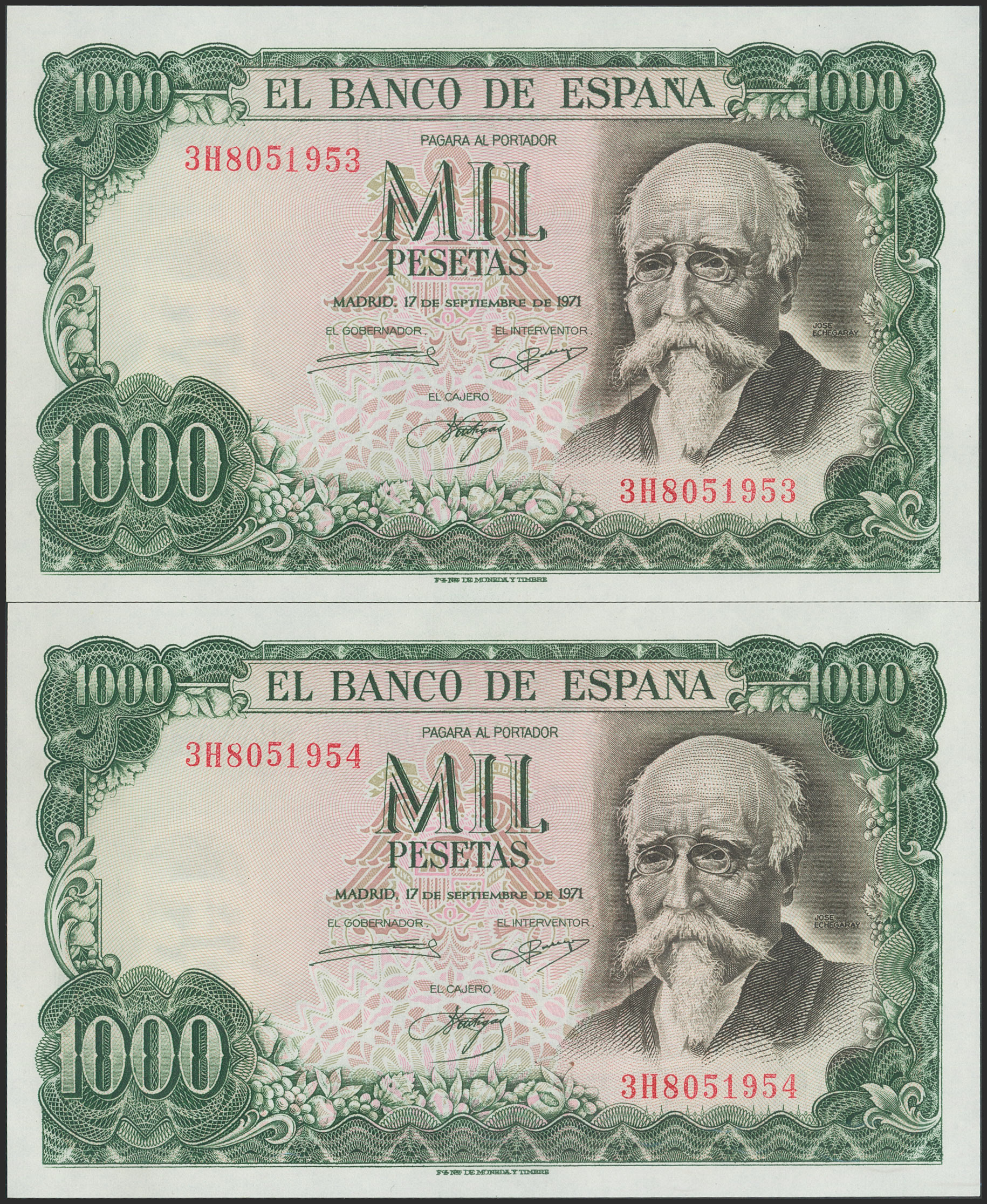 1000 pesetas. September 17, 1971. Correlative couple. 3H series. (Edifil 2017: 474c). original sizing Almost Uncirculated.
