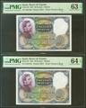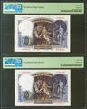 50 pesetas. April 25, 1931. Correlative couple. No serie. (Edifil 2021: 359, Pick: 82). Very rare with original dressing. Uncirculated. PMG64EPQ/63EPQ package.