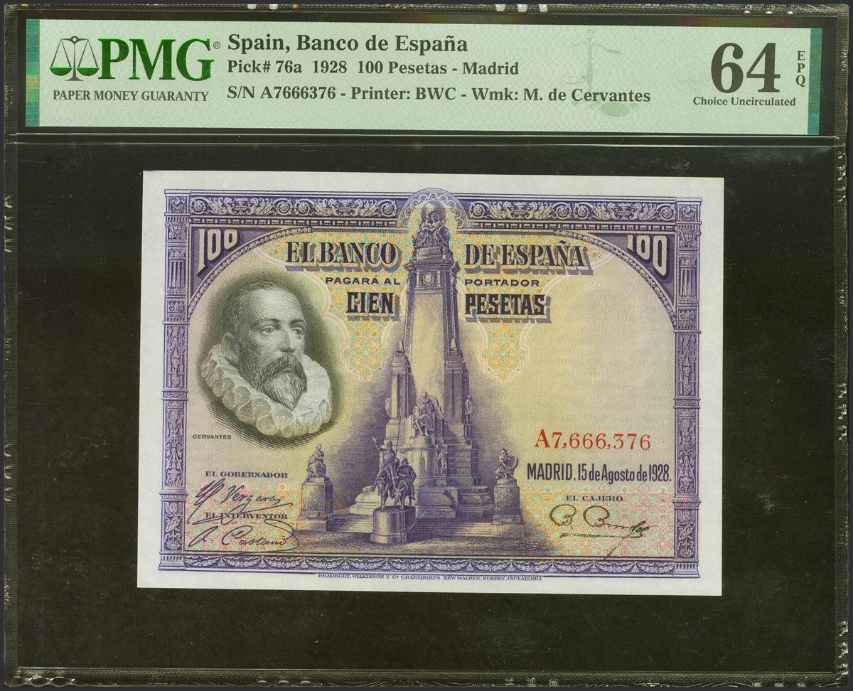 English 100 Pesetas. August 15, 1928. Series A. (Edifil 2021: 355a, Pick: 76a). Rare in this quality, original sizing. Uncirculated. PMG64EPQ package
