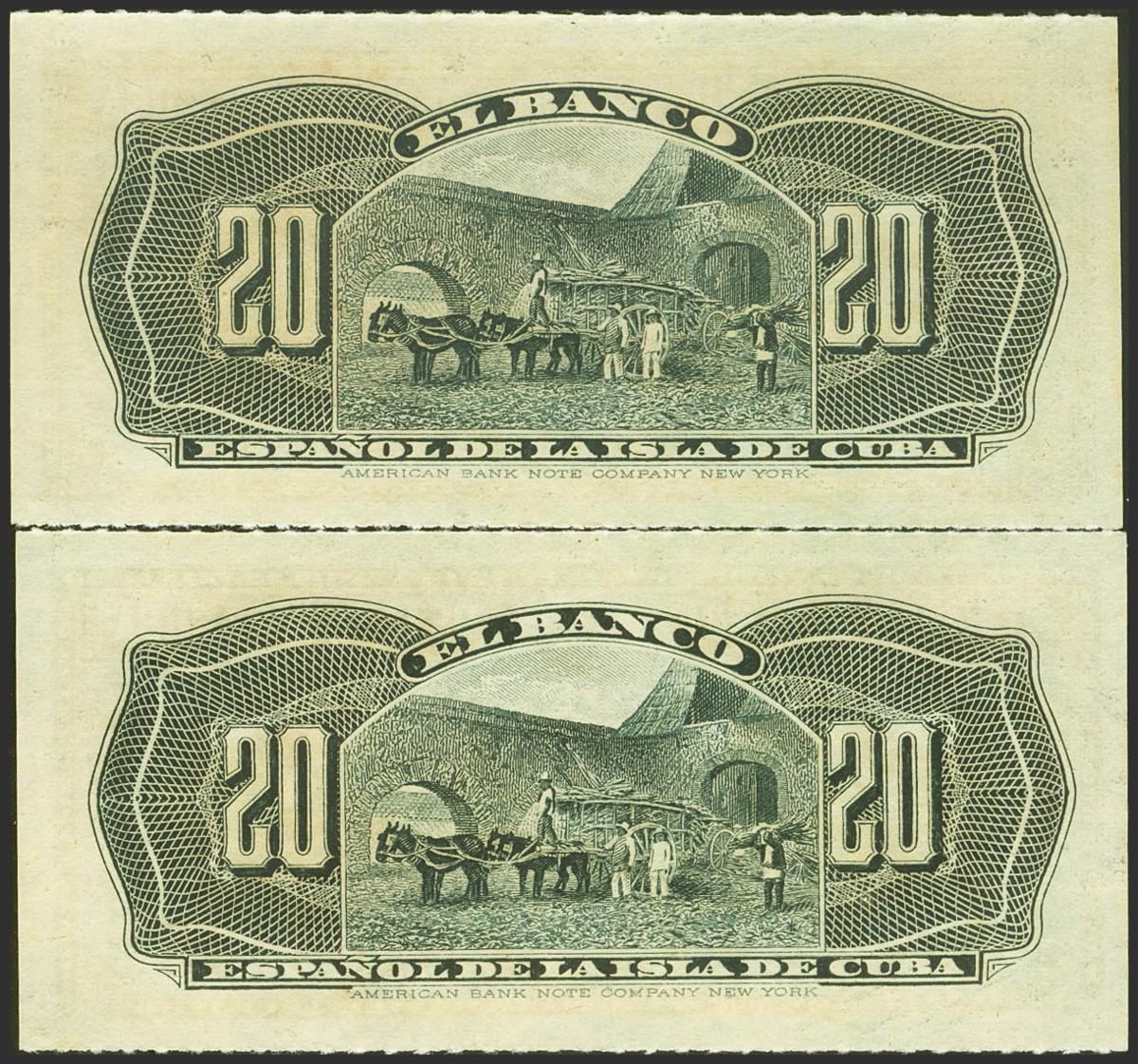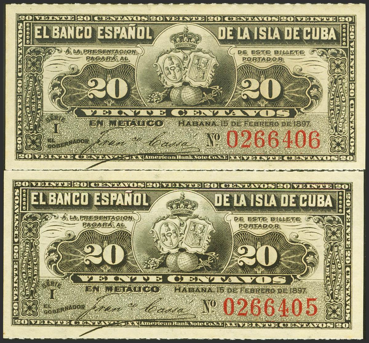 BANCO ESPAÑOL DE LA ISLA DE CUBA. 20 Centavos. 15 de Febrero de 1897. Pareja correlativa. Serie I. (Edifil 2021: 85). SC.