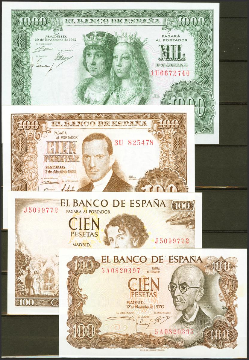 Conjunto de 7 billetes del Banco de España de diferentes emisiones y en muy buenas calidades y conservando su apresto original en cada uno de los ejemplares. SC/SC-. A EXAMINAR.